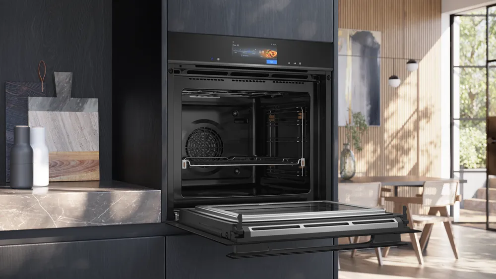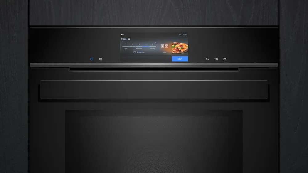 Worried about overcooking your food? Pre-installed, automated baking and roasting programmes in your oven guarantee ideal preparation. Simply select your dish via the TFT-Touchdisplay and the oven’s sensors control the process. Select a result from various suggestions to suit your preferences or time. The oven automatically applies the correct settings and functions and turns off when your dish is ready, so you can relax while your food is cooking.